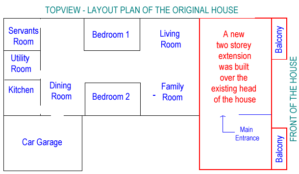 The front of the house or the " head " of the house was "chopped " off and in it's place a new two storey front was built. Please see below:-